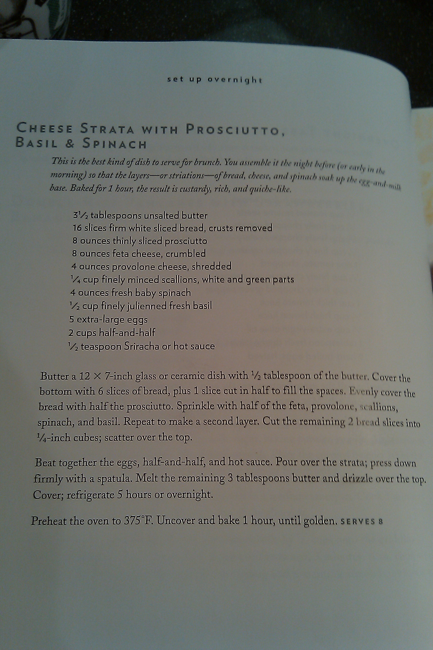 As we were flipping through, we came across a recipe for cheese strata with spinach, Procuitto, and basil. We decided it was the perfect thing for Christmas morning. I assembled it the night before and when we got up in the morning, before opening gifts, we popped it right in the oven. It was perfectly done just as we finished with the gifts.