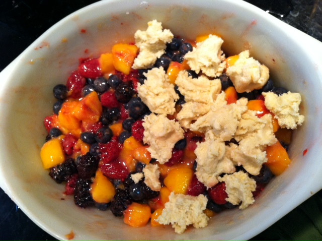 I found this cobbler in this month’s Bon Appetit. The original was just a blueberry cobbler, but I had an assortment of summer fruits and decided to use them all. Just blueberries would have been fine, but I loved the combo of the other berries and peaches. The crust was the real winner though. It was crumbly on top, light and fluffy inside. The perfect sweet biscuit topping and super easy to put together. I might make this topping into actual biscuits sometime soon for strawberry short cake. It would be perfect.